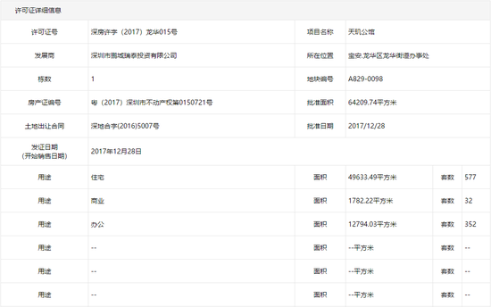 深圳市房地产信息平台显示,天玑公馆的项目许可证上写明——用途为办公的房源套数为352套,正是C座的户数。