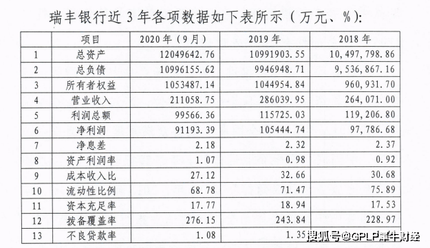据瑞丰银行2021年同业存单发行计划,截至2020年9月末,瑞丰银行资产总额1204.96亿元,总负债1099.62亿元,净资产105.35亿元;不良贷款率1.08%,较2019年末降0.27个百分点;拨备覆盖率276.15%,资产充足率17.77%,实现营业收入21.11亿元,实现净利润9.12亿元。
