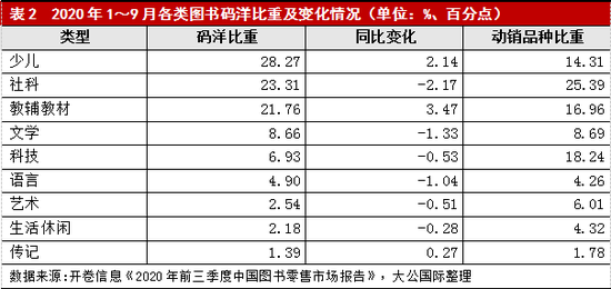 疫情背景下,少儿、教辅教材类具有刚需性质的图书及传记类码洋比重同比有所增长,其余各类图书码洋占比均有所下降。疫情严重时期要求居家隔离,购物需求主要集中在刚需类商品上,对非刚需类商品如文学、社科等大众图书的需求相对减少,而教辅教材、考试等图书具有刚需性质,仍存在大量需求。