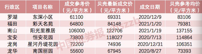 以罗湖区东深小区为例,该小区官方发布的二手房参考价为61100元/平米,但贝壳网显示去年12月成交的一套二手房价格为69331元/平米,贝壳网的参考均价为83106元/平米。