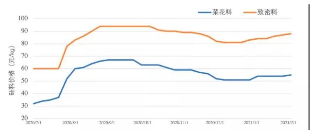 根据行业研究机构PVInfolink 2月3日公布的硅料价格,菜花料、致密料的均价分别为55元/kg、88元/kg。相对于最低点,已经分别上涨了90%、50%,当前价格已经逼近一年来的最高点。