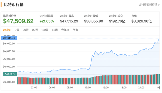 消息一出,比特币短线拉升!迅速攀上4万美元关口,之后势头不减,比特币24小时涨幅达21.65%,截至发稿报47509美元,创下历史新高。
