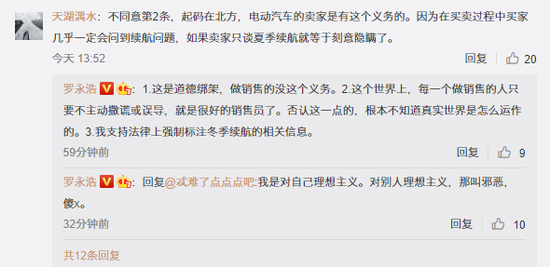 不过,有网友却不同意这样的观点,其在罗永浩微博下面表示,“在北方,电动汽车的卖家是有这个义务的(主动告知电动车冬季掉电)。因为在买卖过程中买家几乎一定会问到续航问题,如果卖家只谈夏季续航就等于刻意隐瞒了”。