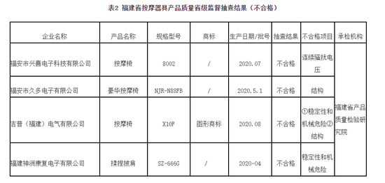 近期,依据《中华人民共和国产品质量法》,福建省市场监督管理局组织对按摩器具产品质量省级监督抽查,抽查产品包括脚部按摩器、电动锤、按摩棒、按摩披肩、腰部按摩器、颈椎按摩器、腰部按摩器、按摩垫、电动足浴按摩器、按摩保健床、多功能按摩椅产品,共抽查29家生产企业29批次产品,不合格产品4批次,不合格发现率为13.8%。