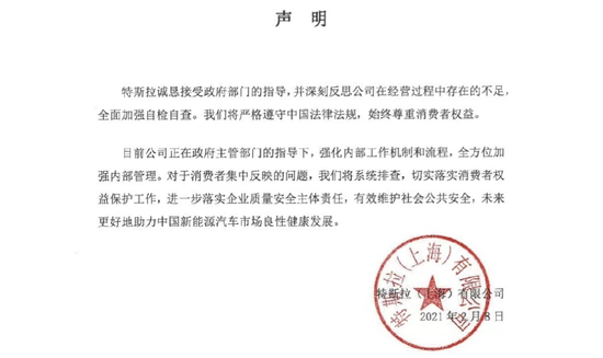 “特斯拉诚恳接受政府部门的指导,并深刻反思公司在经营过程中存在的不足,全面加强自检自查。”针对被五部门约谈一事,特斯拉方面向未来汽车日报回应称,目前公司正在政府主管部门的指导下,强化内部工作机制和流程,全方位加强内部管理。“对于消费者集中反映的问题,我们将系统排查。”
