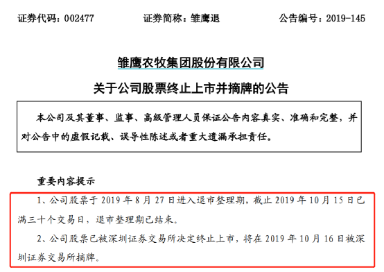 随后雏鹰农牧业绩就急转直下,公司负债不断增加、侯建芳质押股票面临“爆仓”风险…最终引发雏鹰农牧债务危机,股价也持续走低。2019年10月15日,雏鹰农牧发布公告称,公司股票于8月27日进入退市整理期,截止10月15日已满三十个交易日,退市整理期已结束。公司股票已被深交所决定终止上市,将在2019年10月16日被深交所摘牌。曾经的“养猪第一股”成为A股史上“破面值”退市第二股。