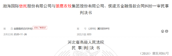 另外,裁判文书网显示,此前渤海国际信托因金融借款纠纷将雏鹰农牧及侯建芳告上法庭((2018)冀民初84号)。河北省高级人民法院经审理判决雏鹰农牧向渤海国际信托偿还本金人民币9900万元以及违约金、财产保全费等费用。