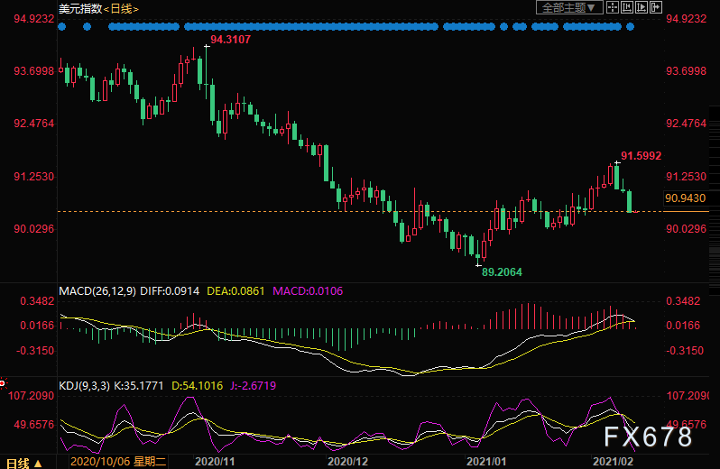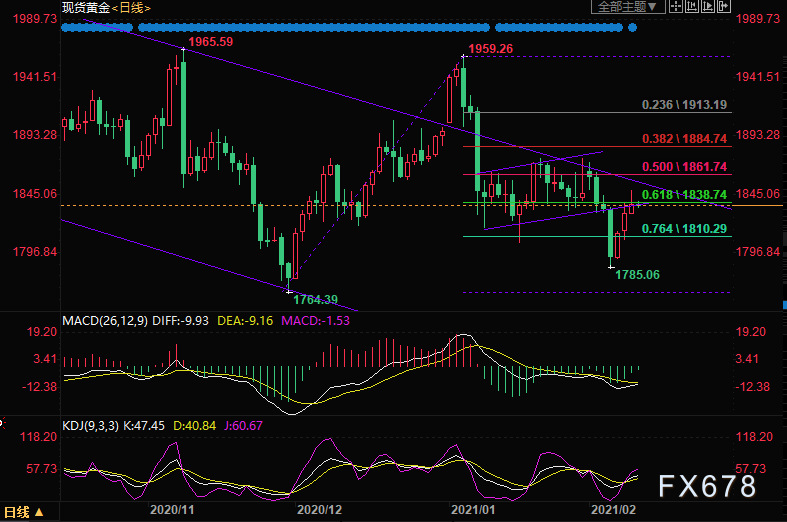 周三(2月10日)现货黄金小幅上涨,交投于1840附近,周二(2月9日)金价涨0.41%至1838.32美元/盎司,因美元走软以及寄望美国出台更多财政刺激措施,提振了黄金对寻求对冲通胀的投资者的吸引力。同时美债收益率下跌也为金价提供部分动能,但12月职位空缺意外升至五个月高点小幅拖累金价。金价短线三连涨。周二的冲高回落对多头信心打击较大。短线关注61.8%斐波回撤位1838一线的争夺。