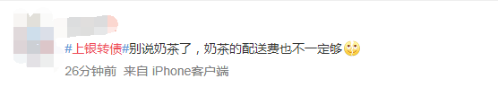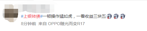 有网友表示,“上银转债中签一手,今天上市,赚了个寂寞,一千块一个月时间搁余额宝也赚一块多了”,“(赚了)一个茶叶蛋,好歹上一次大秦是一杯奶茶”,“别说奶茶了,奶茶的配送费也不一定够”,“一顿操作猛如虎,一看收益三块五”,“赚了三块多,以后不打新债了,心累”,