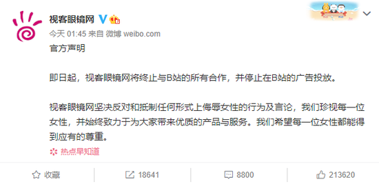视客眼镜网也发微博表示,即日起,视客眼镜网将终止与B站的所有合作,并停止在B站的广告投放。视客眼镜网坚决反对和抵制任何形式上侮辱女性的行为及言论,我们珍视每一位女性,并始终致力于为大家带来优质的产品与服务。我们希望每一位女性都能得到应有的尊重。