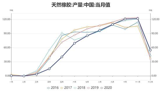 从国内产胶规律来看,国内天胶产量90%以上产自海南、云南地区,一般进入11月末之后,国内产区陆续进入停割,进入2月,国内产区全面停割,3月底国内产区试开割,自每年4月,在气候较好的前提下产量回升,随之海南、云南两个地区雨季来临,主要集中在5-10月份,不过进入9月中旬之后,雨季基本结束,胶水供应量大增,加工厂也会抓紧时间生产,产出量大幅增加,10月份一般是天胶产量单月最高值。当前国处于停割。