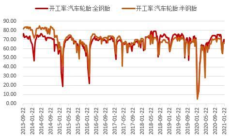 截止1月29号,国内轮胎市场全钢胎开工率为66.81%,半钢胎开工率维持64.21%。