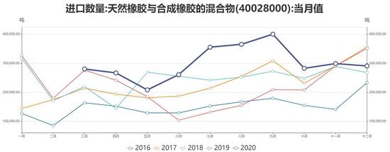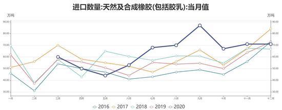 2020年12月中国进口天然及合成橡胶(含胶乳)合计71.3万吨,同比降2.1%。2020年中国进口天然及合成橡胶(含胶乳)共计746.8万吨,同期增加13.6%。