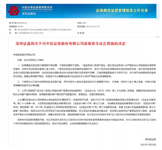 2月10日消息,深圳证监局官网公布了关于对中信证券采取责令改正措施的决定,涉及私募基金托管业务、投行保荐、资产管理三大重要业务条线。