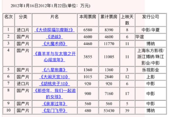 2012年,国内引进片额增加到34部,新增的14个名额全为美国大片。这一年《大侦探福尔摩斯2》和《碟中谍4》在春节崭露头角,好莱坞大片的影响力在春节期间达到顶峰。其中《福尔摩斯2》以6580万问鼎周冠军,累计票房达8390万。1月28日,《碟中谍4》也因汤姆·克鲁斯的回归而引发了观影高潮。