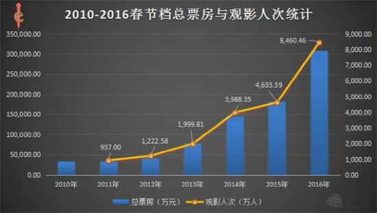 2015年,春节档八部电影同台竞争,冲破了30亿票房。2016春节档因《美人鱼》等一众影片的优异表现,在七天创下了33.92亿票房成绩,这也是全球最高的单周票房。