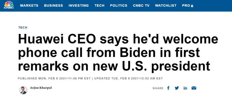 “我欢迎这样的电话。”据美国消费者新闻与商业频道(CNBC)消息,华为创始人、CEO任正非2月9日在山西太原出席“智能矿山创新实验室”揭牌仪式时表示,欢迎美国新任总统拜登致电华为。报道称,这是美国新总统就任以来任正非首次公开讲话。