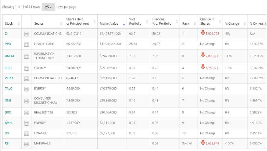 Q4重仓股中,凯雷持仓互联网营销公司ZoomInfo(ZI.US)9321.73万股,持仓占比60.21%,位列第一;