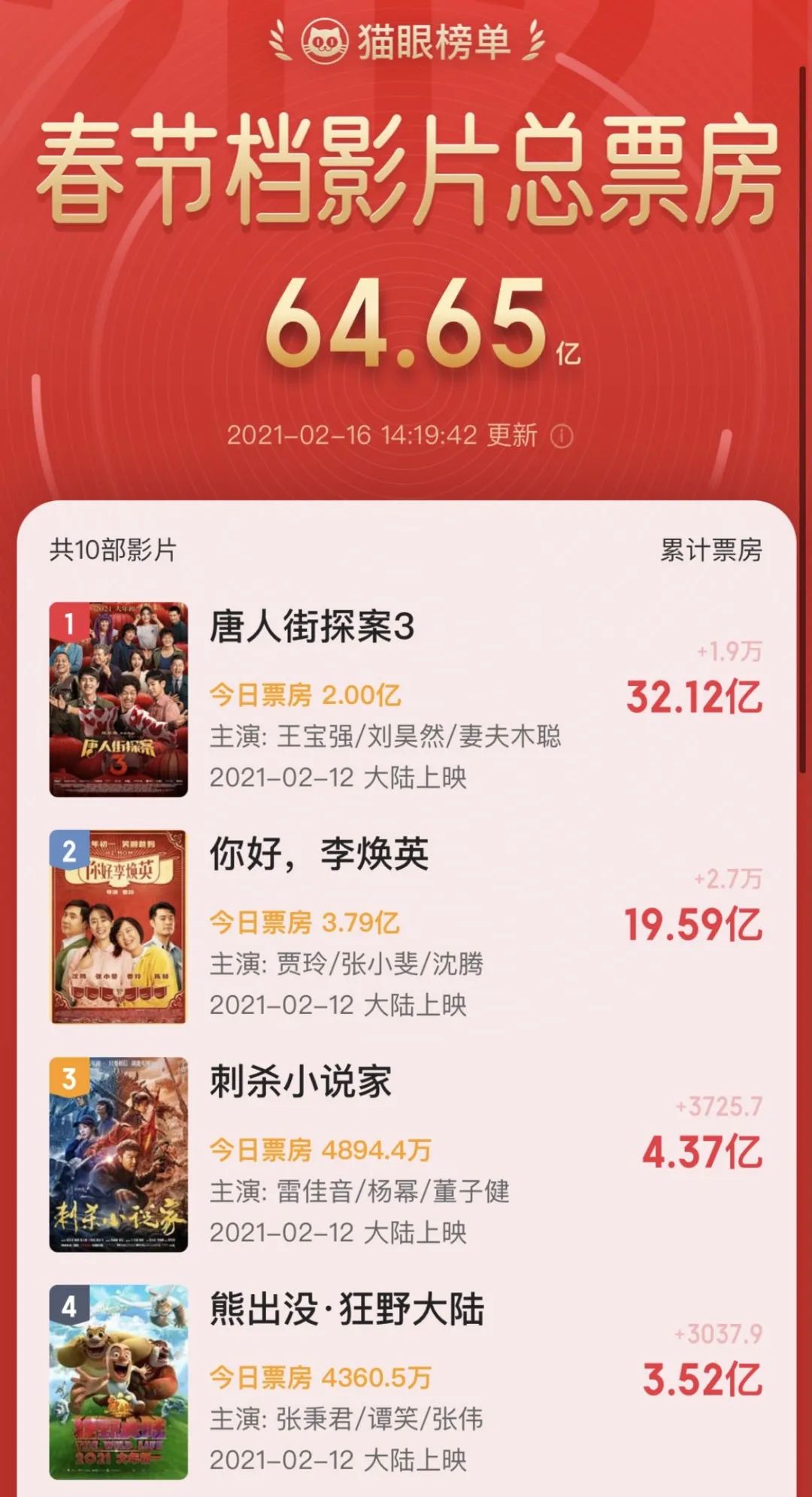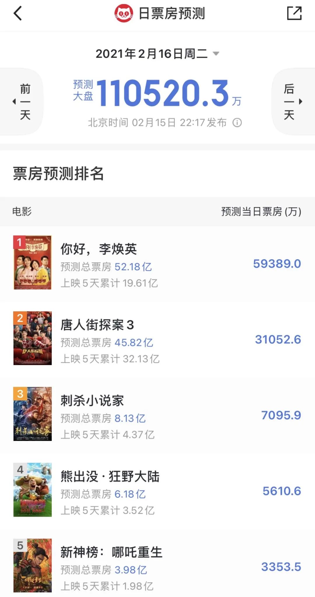 2月15日,《你好,李焕英》的单日票房产出已经超过了《唐人街探案3》,从亚军一跃成为单日票房榜首位。2月16日的预售票房和票房都是《唐探3》的约2倍,并且,二者的排片占比正在、上座率正在发生转变。