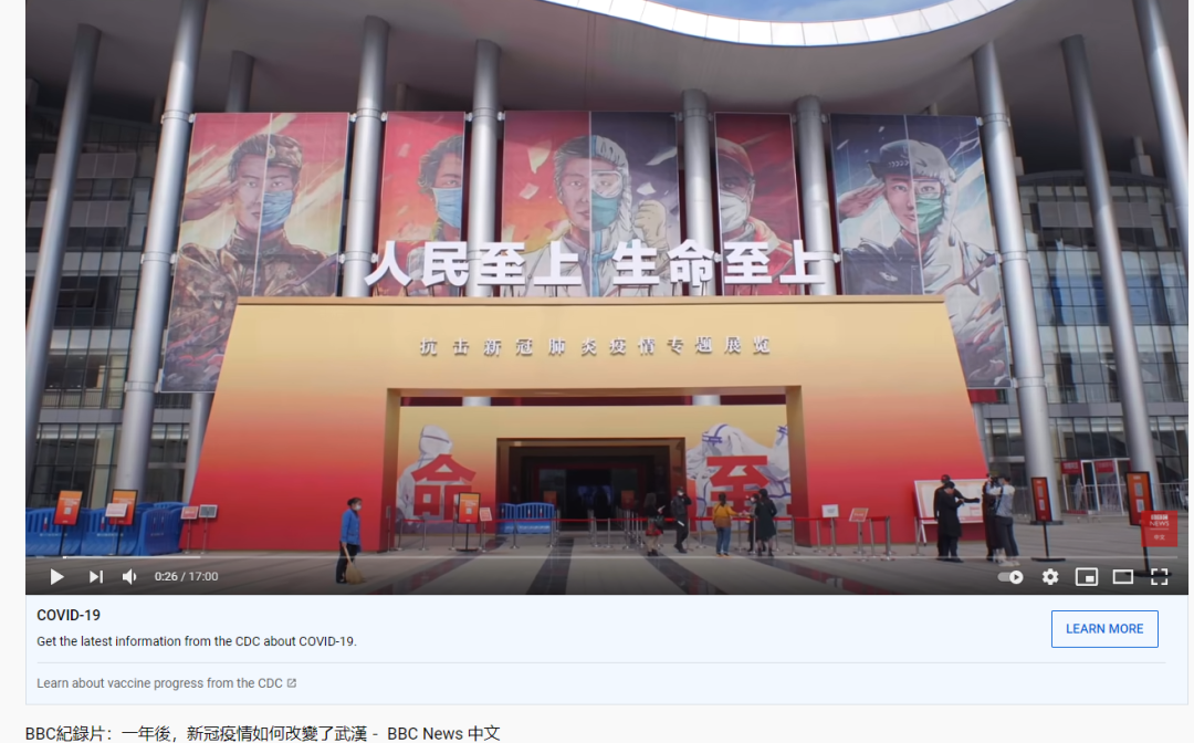 原来,有中国网民近日在境外视频网站Youtube上观看BBC于去年12月推出的一期名为“一年后,新冠疫情如何改变了武汉”视频报道时发现,尽管这家英国媒体在其英文版和中文版的账号上,都使用了一模一样的节目内容,可这两个不同语言版本的视频中竟然呈现出了截然不同的色彩效果!