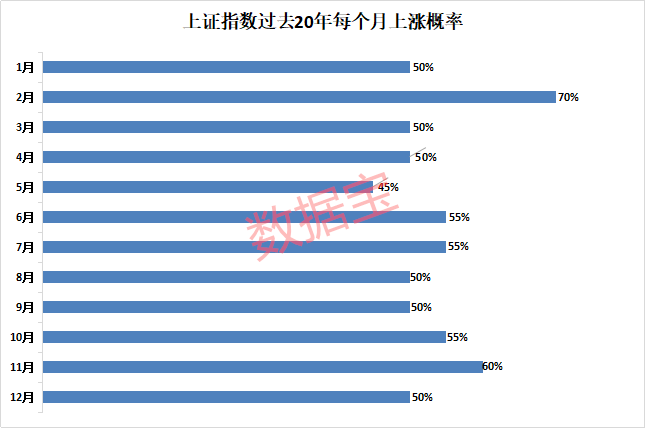 除了节后的行情之外,其他月份的上涨概率会是什么样呢?以近20年的大盘指数月度涨跌幅数据分析发现,2月份上涨概率最高,达到70%;其次是11月份,上涨概率达到60%。6月份、7月份及10月份上涨概率都达到了55%,仅次于2月份和11月份。