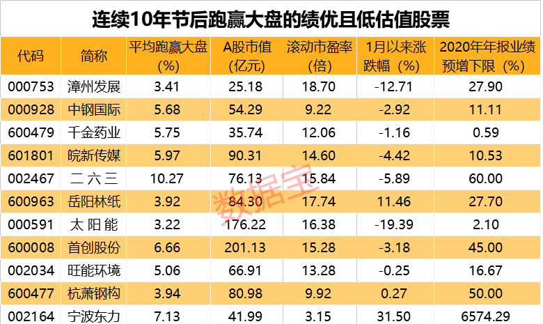 值得注意的是,上述176只个股中有11只股票属于2020年报业绩绩优且估值较低的股票。宁波东力(维权)近十年春节后5个交易日平均跑赢大盘7.13%,公司预计2020年净利润同比增加6574%,最新市盈率仅3.15倍。另外,二六三、岳阳林纸、首创股份等个股的市盈率均不足20倍。