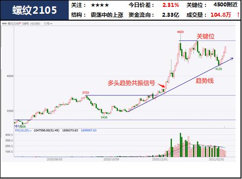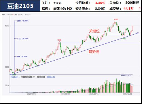 近期宏观数据向好叠加美国经济刺激方案落地,商品走强,上破关键位后今日再次收于趋势线上方,市场多头氛围浓厚。能化板块如期走强仍要重点追踪,有色板块的多头结构也可关注。临近春节,建议降低预期,锁定利润为主。