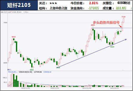 原料端,近期PTA、EG价格上涨较多,短纤补涨意愿较浓,同时,需求端需求较为旺盛,超卖现象较为严重,虽然春节期间可能开工时间更多,但是压力仍不大。上个交易日出发多头趋势共振信号后,盘中再次走强,目前能化板块联动强势。操作上上方空间仍可追踪。