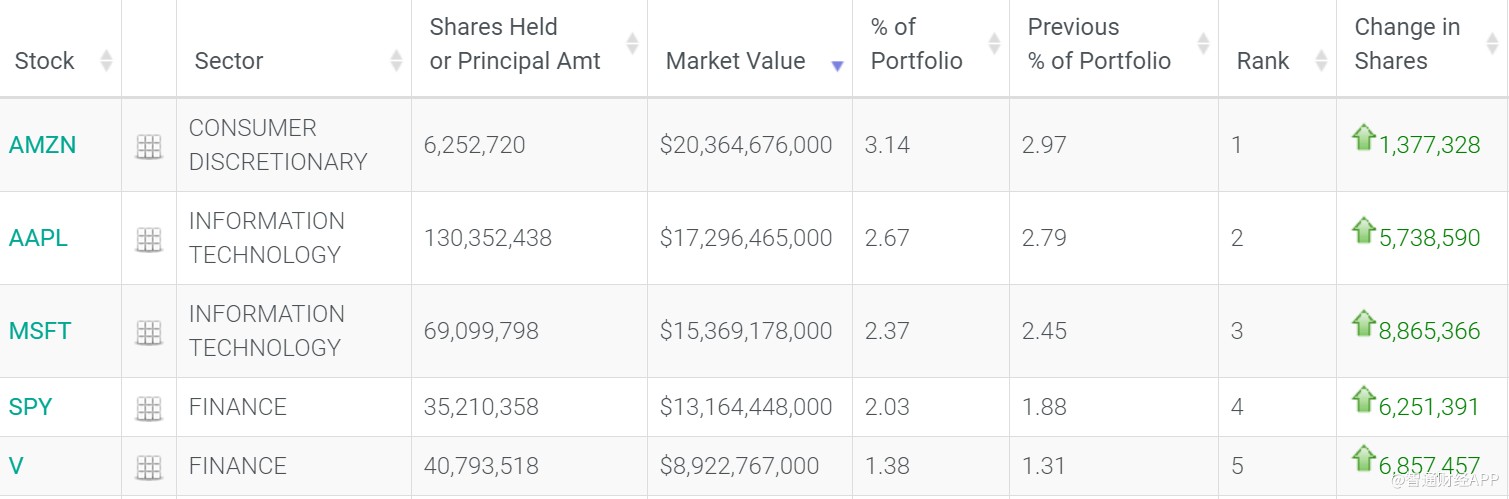 标准普尔500指数ETF(SPY.US)位列第四,仓位比重为2.03%,持仓市值约131.64亿美元。