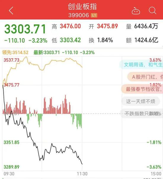 创业板指开盘还涨超1.8%,不过开盘几乎就是最高点位,之后一路杀跌,到上午收盘大跌3.23%,高开低走,惨不忍睹。创业板权重股宁德时代、爱尔眼科、迈瑞、亿纬锂能、智飞生物跌幅惨烈。