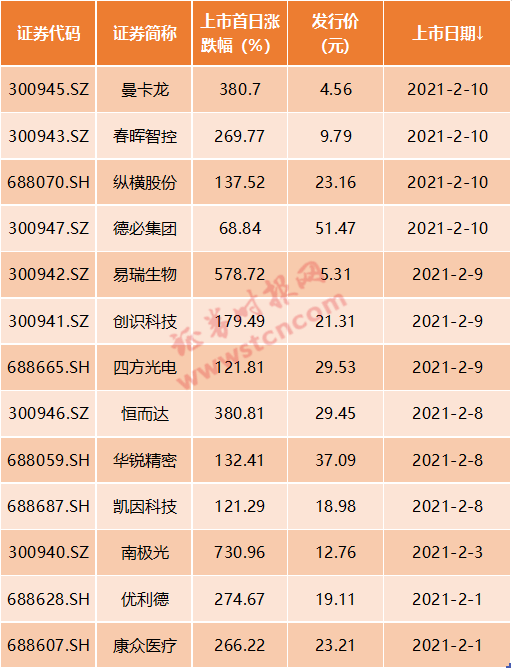 其中,2月3日上市的南极光,上市首日大涨730.96%,是创业板实施注册制以来首日涨幅第三高的新股,仅次于康泰医学(首日涨1061.42%)和卡倍亿(首日涨743.27%)。南极光发行价为12.76元/股,按首日收盘价计算,中一签收益可达4.66万元。
