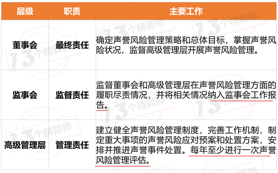 ③监事会要将声誉管理纳入工作报告,管理层每年至少一次组织声誉风险管理评估。