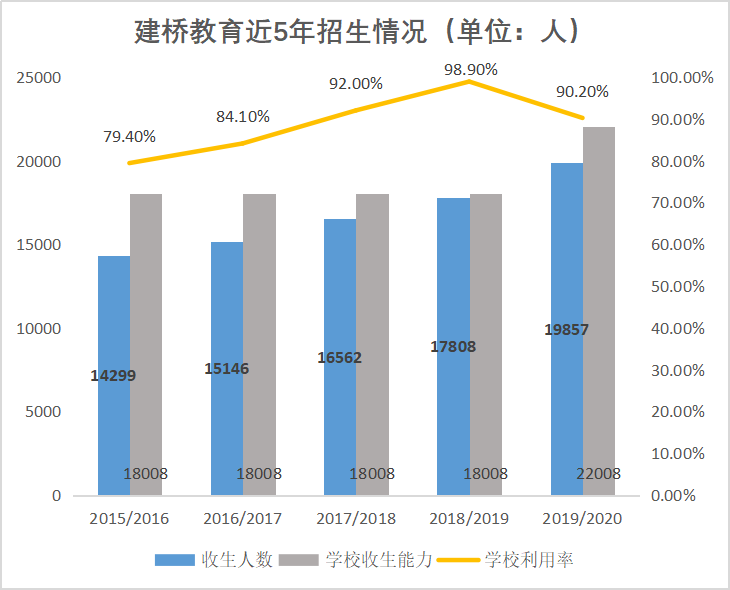 2019/2020学年,建桥教育约2万人,相较于去年同期增长12.4%,校园利用率90.2%。建桥教育的收生人数在近5年有明显增长的趋势,尤其2018/2019学年,增长幅度最大。