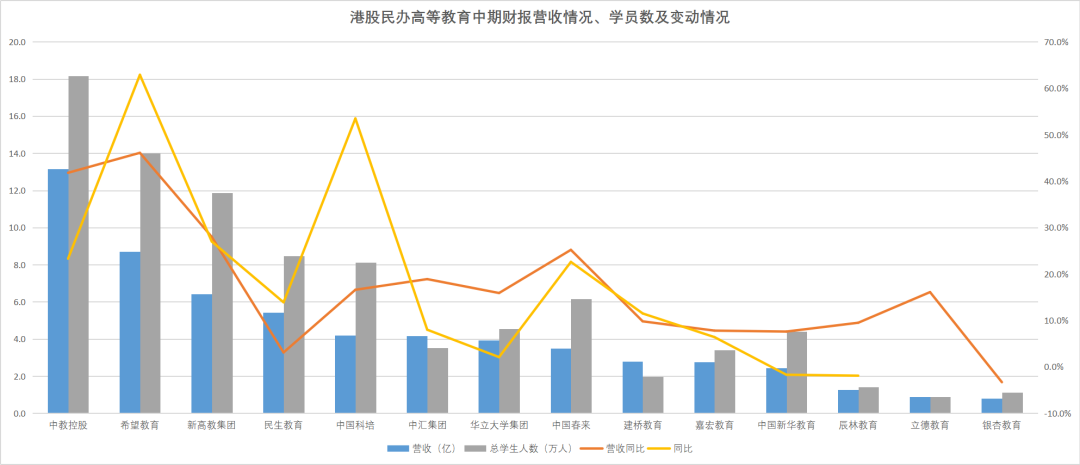 由下图可见,营收体量和总学生人数排在中线及中线之前的均为民办高校集团。而建桥教育作为单体高校,很难跻身前列。