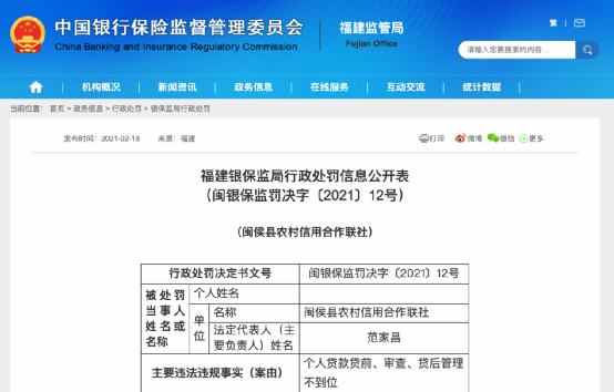 2月18日,福建银保监局行政处罚信息公开表(闽银保监罚决字〔2021〕12号)显示,闽侯县农村信用合作联社因个人贷款贷前、审查、贷后管理不到位,被中国银保监会福建监管局合计罚款100万元。