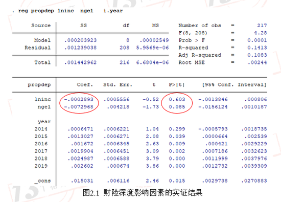 而人均可支配收入对财险深度的影响系数不显著,恩格尔系数对财险深度的影响系数仅在10%显著性水平下是显著的。