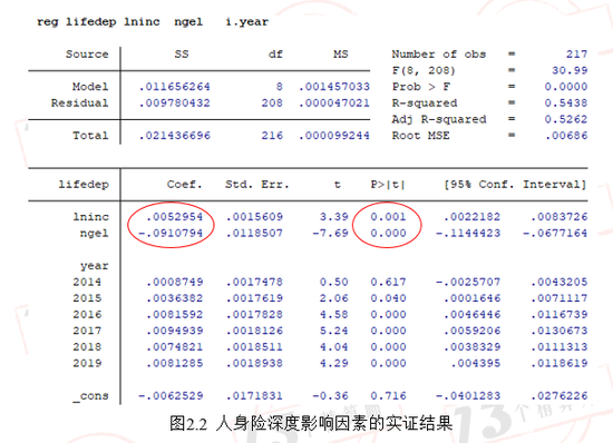 人均可支配收入、恩格尔系数对人身险深度的影响系数均在1%显著性水平下是显著的;