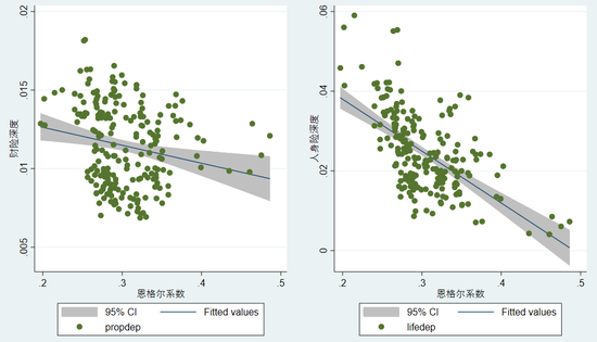 下面两个图分别是人均可支配收入、恩格尔系数分别与财险深度、人身险深度的散点图关系。