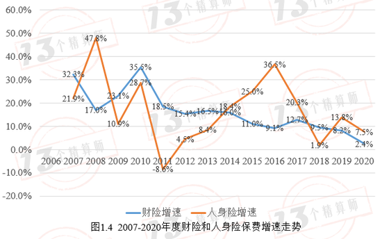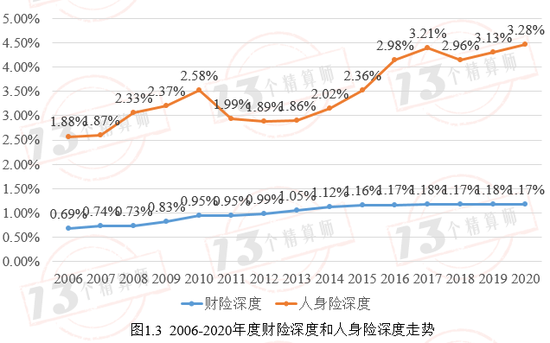“13精”也列出了2006-2020年我国财产险和人身险保费规模走势及人身险占比(人身险险保费规模占全行业的比重)