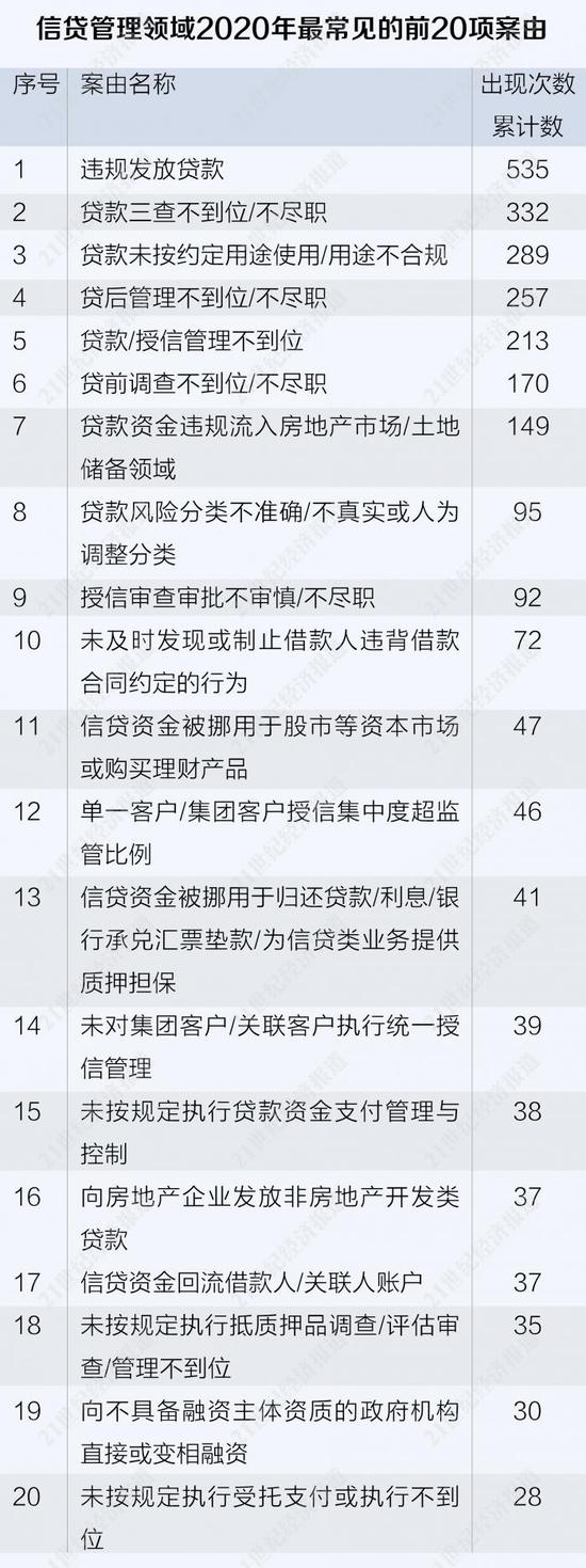 违规发放贷款累计出现535次居第一位,是信贷业务违规中最常见的案由。贷款三查不到位/不尽职出现332次,贷款未按约定用途使用/用途不合规出现289次,贷款/授信管理不到位出现213次,贷款资金违规流入房地产市场/土地储备领域出现149次。