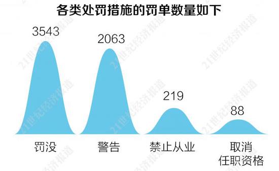 从处罚措施看,罚没是监管使用最多的处罚措施,2020年有3543张罚单采取了罚没的措施,有2063张罚单处以警告,有219张罚单做出禁止一定期限银行从业资格的处罚,取消任职资格的罚单有88张。