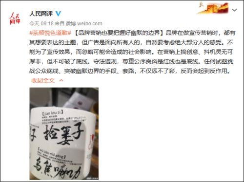 @人民网评强调,在营销上搞创意、抖机灵无可厚非,但不可破了底线。守法遵规,尊重公序良俗是红线也是底线。任何试图挑战公众底线、突破幽默边界的手段、套路,不仅添不了彩,反而会起到反作用。