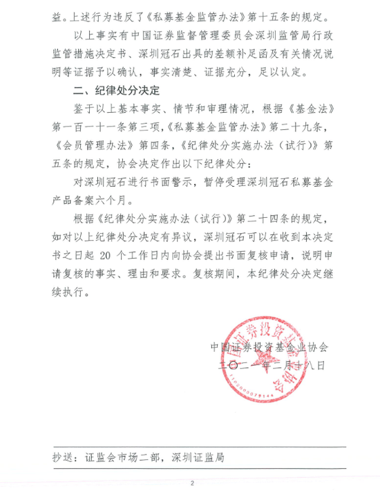 春节后首个周五(2月19日),中国证券投资基金业协会开出7份纪律处分决定书,其中,深圳市冠石资产管理有限公司收到纪律处分决定书。因深圳冠石通过提供“差额补足函”的形式向管理的私募基金产品“冠石泰盈1期私募证券投资基金”、“浙分-冠石定制1期私募证券投资基金”、“泰诚-冠石-泰盈3期私募证券投资基金”的投资者承诺本金不受损失及最低收益。