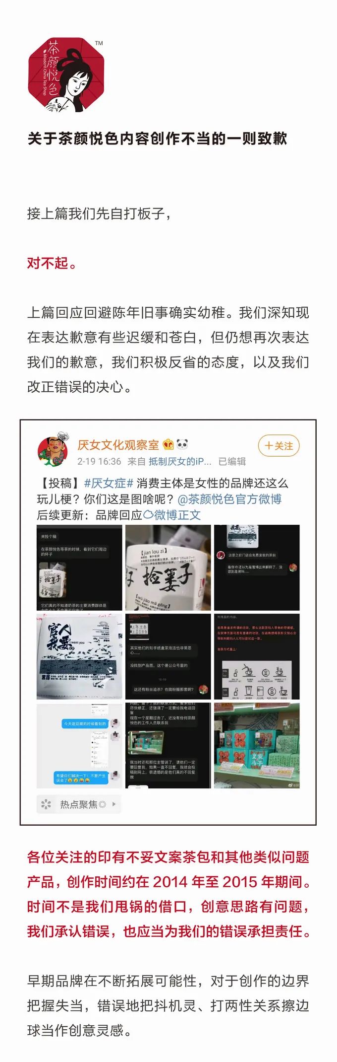随后,2月19日-20日,茶颜悦色两度发声道歉,并解释,“句子造得生硬,没有把握好尺度,没有做到不会产生歧义······”这被网友理解为:“茶颜悦色坦白了,广告词没技术处理好”,“这说明文案在设计方向上就已经有问题”。