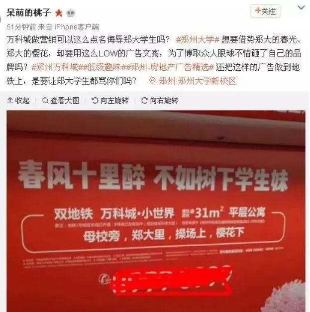 2018年,郑州万科城的广告“春风十里醉,不如树下学生妹”,由于万科城位置就在郑州大学新校区,此举被认为点名侮辱郑大学子,引发众怒。