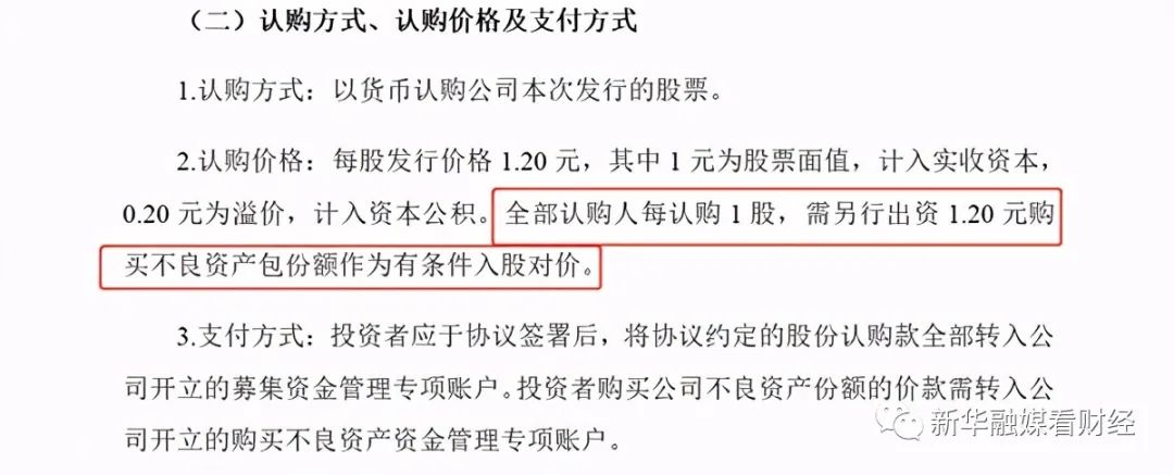 记者在定向发行说明书中看到,运城农商银行在定增方案中加入了同时购买不良资产的“附加”要求。该公司本次发行的股票每股价格1.20元。全部认购人每认购1股,需另行出资1.20元购买不良资产包份额作为有条件入股对价。运城农商银行的定增申请已于2020年12月4日获证监会批准。