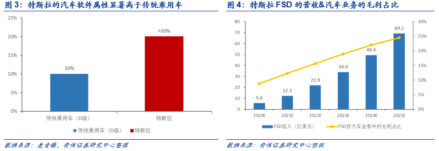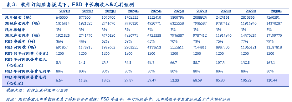 在2020年2月我们发布的报告《划时代新物种:特斯拉越来越像苹果了》中,我们反复强调:特斯拉就是汽车界的“苹果”,软件会是其商业模式核心组成部分。通过此前的量化分析,我们预测特斯拉的OTA软件业务(FSD)有望在2025年将贡献汽车业务毛利的1/4;从中长期来看,FSD将大概率切换成软件订阅服务的商业模式,预计2030年的订阅服务收入有望超过160亿美元/年。软件订阅服务的模式下,FSD前期消费门槛进一步降低,有利于提升消费者的购买率,并且也符合马斯克所倡导的软件持续收费的商业模式,未来FSD将大概率切换成软件订阅服务的商业模式。基于软件订阅服务模式下,我们预测2030年特斯拉将有超过1700万存量车主用户,其中近80%将成为FSD的订阅付费用户,FSD的订阅服务费将达到160亿美元/年。
