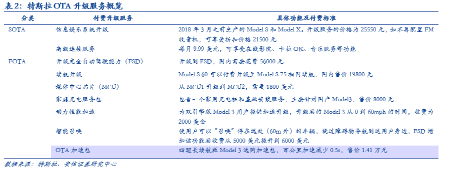 特斯拉作为全球第一个使用FOTA技术的车厂,不仅通过SOTA实现车载信息娱乐系统的更新,也能够延伸至自动驾驶、车身控制、电池管理等核心领域的FOTA升级,提升车辆自身性能。同时通过特斯拉APP进行OTA软件更新服务,实现软件服务收费的盈利模式,具体包括:1)首次引入了软件应用商店(in-app-purchase),方便用户购买软件升级。未来所有特斯拉车主都可以在特斯拉的APP中购买各种软件更新服务。例如,基本版自动辅助驾驶(Autopilot),完全自动驾驶(FSD),加速性能提升以及其他高端功能;2)开启高级连接服务收费(9.9美元/月)。只有车主支付了服务费才能用实时路况、卡拉OK、流媒体等功能。