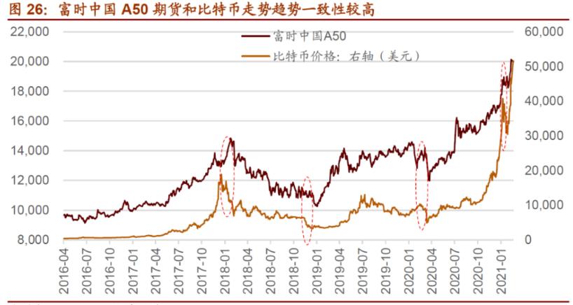 比特币价格与A50指数期货相关度较高,且比特币价格较为纯粹反映流动性的变化,因此比特币价格对A50指数期货有一定的领先效果,如果后续比特币价格出现大幅调整,这可以作为一个风险评估的标准。2017年以来比特币多次提前预告了A50指数的大跌。