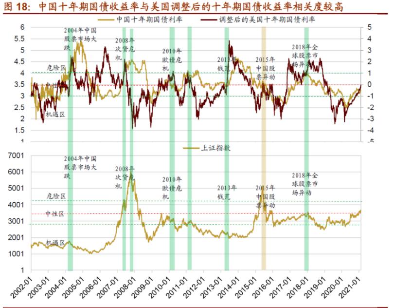 具体来看,中国十年期国债收益率与美国调整后的十年期国债收益率相关度较高。当美债收益率快速上行突破至危险区域,往往中国的十年期国债利率也会突破至3.5以上。过去20年,当调整后的10年期美债收益率在1%以上,同时中国10年期国债收益率在3.5%以上,就会触发A股的大幅调整。